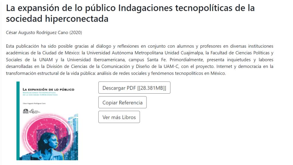 Primordialmente, presenta inquietudes y labores desarrolladas en la División de Ciencias de la Comunicación y Diseño de la UAM-C, con el proyecto. Internet y democracia en la transformación estructural de la vida pública: análisis de redes sociales y fenómenos tecnopolíticos en México.