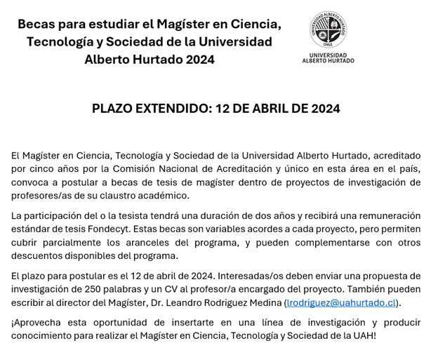 The Science, Technology and Society MA program at the Alberto Hurtado University is giving two-years scholarships.