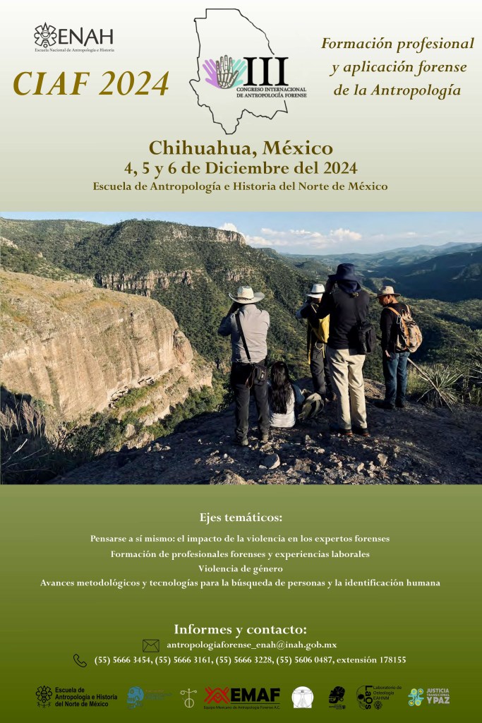 La Escuela Nacional de Antropología e Historia, la Escuela de Antropología e Historia del Norte de México, el Equipo Mexicano de Antropología Forense y la Asociación Civil Justicia Transicional y Paz, invitan al Tercer Congreso Internacional de Antropología Forense. Este reunirá a expertos para compartir investigaciones y estrategias sobre el quehacer forense en México y otras regiones.
