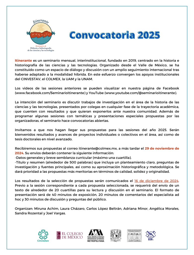 El Seminario Itinerante invita a enviar propuestas de sesiones para 2025. El Seminario es un espacio de diálogo sobre la historia y la historiografía de las ciencias y las tecnologías, apoyado por CINVESTAV, COLMEX, UAM y UNAM.