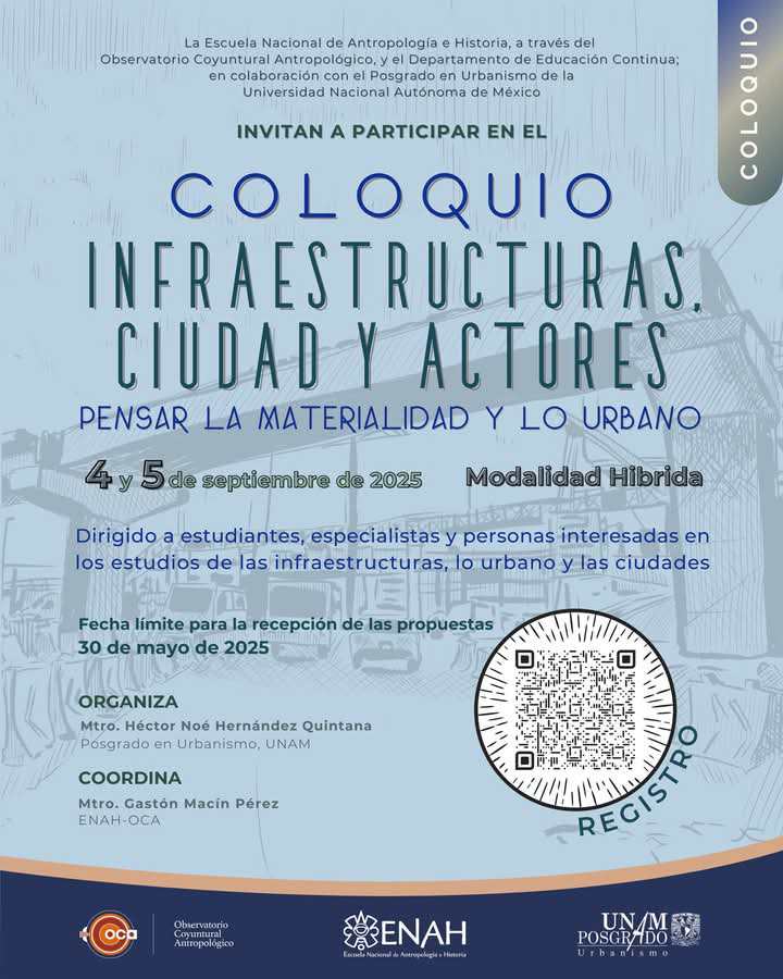 La ENAH y el Posgrado en Urbanismo de la UNAM invitan al coloquio híbrido Infraestructuras, ciudad y actores: pensar la materialidad y lo urbano, que se llevará a cabo el 4 y 5 de septiembre de 2025. Este coloquio está dirigido a estudiantes y especialistas, y estará recibiendo propuestas hasta el 30 de mayo de 2025.