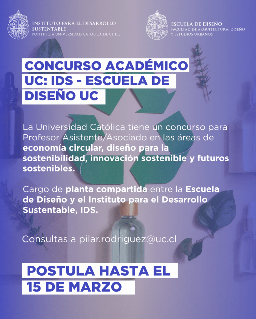 La Escuela de Diseño y el Instituto para el Desarrollo Sustentable (IDS) de la Pontificia Universidad Católica de Chile convoca un concurso para un cargo académico de planta ordinaria. Buscan candidatos/as con formación en Diseño y grado de Magíster/Doctor, especializados en economía circular, innovación sostenible y futuros sostenibles, para integrar docencia, investigación interdisciplinaria y vinculación con el medio.